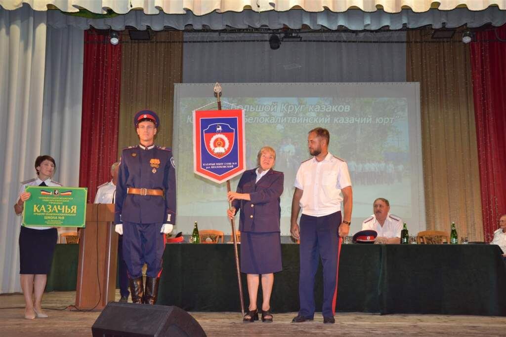 Двум образовательным организациям — школе №8 и Поцелуевской школе, получившим статус «Казачье», — были вручены вымпелы и таблички для фасада здания школы.