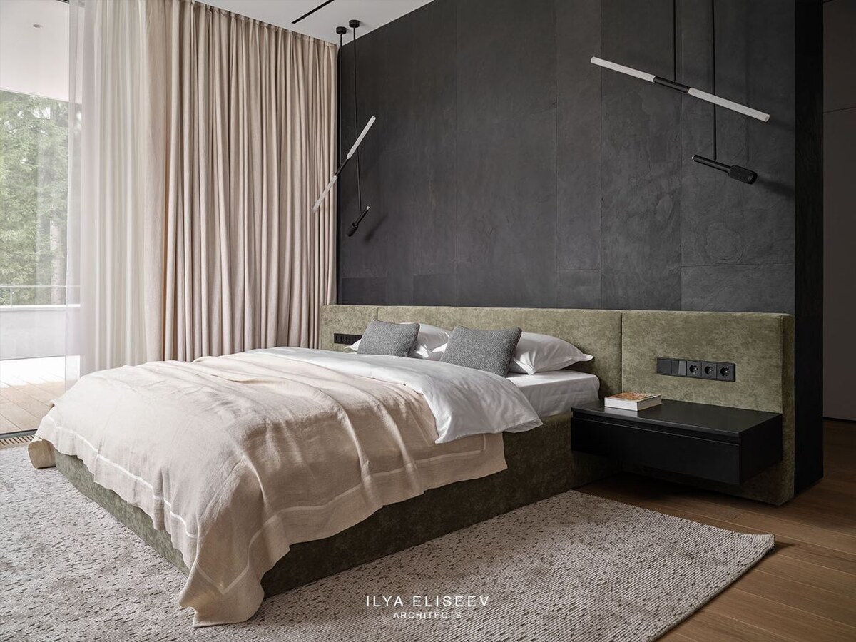 Фактура вместо орнамента В этом интерьере спальни архитекторы бюро ELISEEV сделали ставку на спокойные тона и натуральные материалы. Главный акцент – стена за изголовьем кровати, облицованная каменным шпоном K.black. Матовый глубокий чёрный оттенок создаёт фон, на котором мягко работает свет и текстиль. Камень не требует дополнительного декора: фактура сама по себе добавляет глубины и собирает пространство. В итоге спальня выглядит строгой, но тёплой и уютной. Проект: дом Green grove 400 м² в коттеджем поселке Зелёная роща Автор: Бюро интегральной архитектуры ELISEEV Посмотреть проект целиком можно здесь Заказать каменный шпон: @flat_stone или +7 (495) 542-43-10