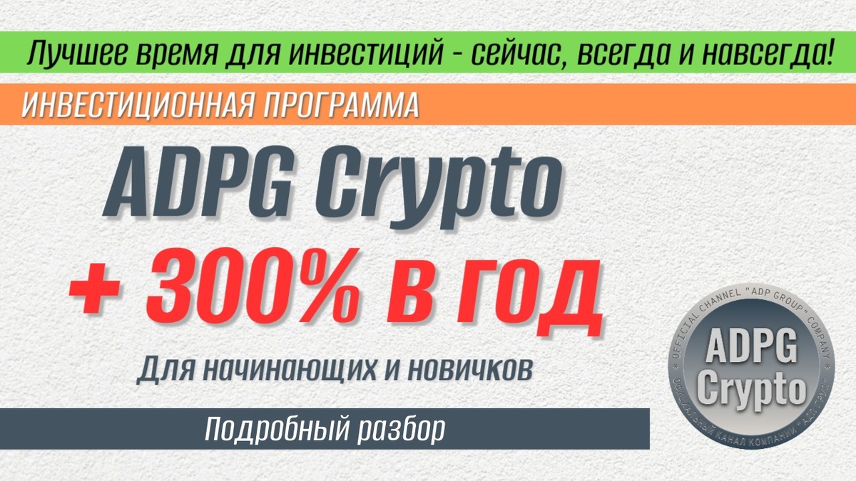 В рамках проекта "ADPG Crypto" разработана и действует Инвестиционная программа, по которой Инвестор может ежемесячно получать доход в размере не менее 300% в год.