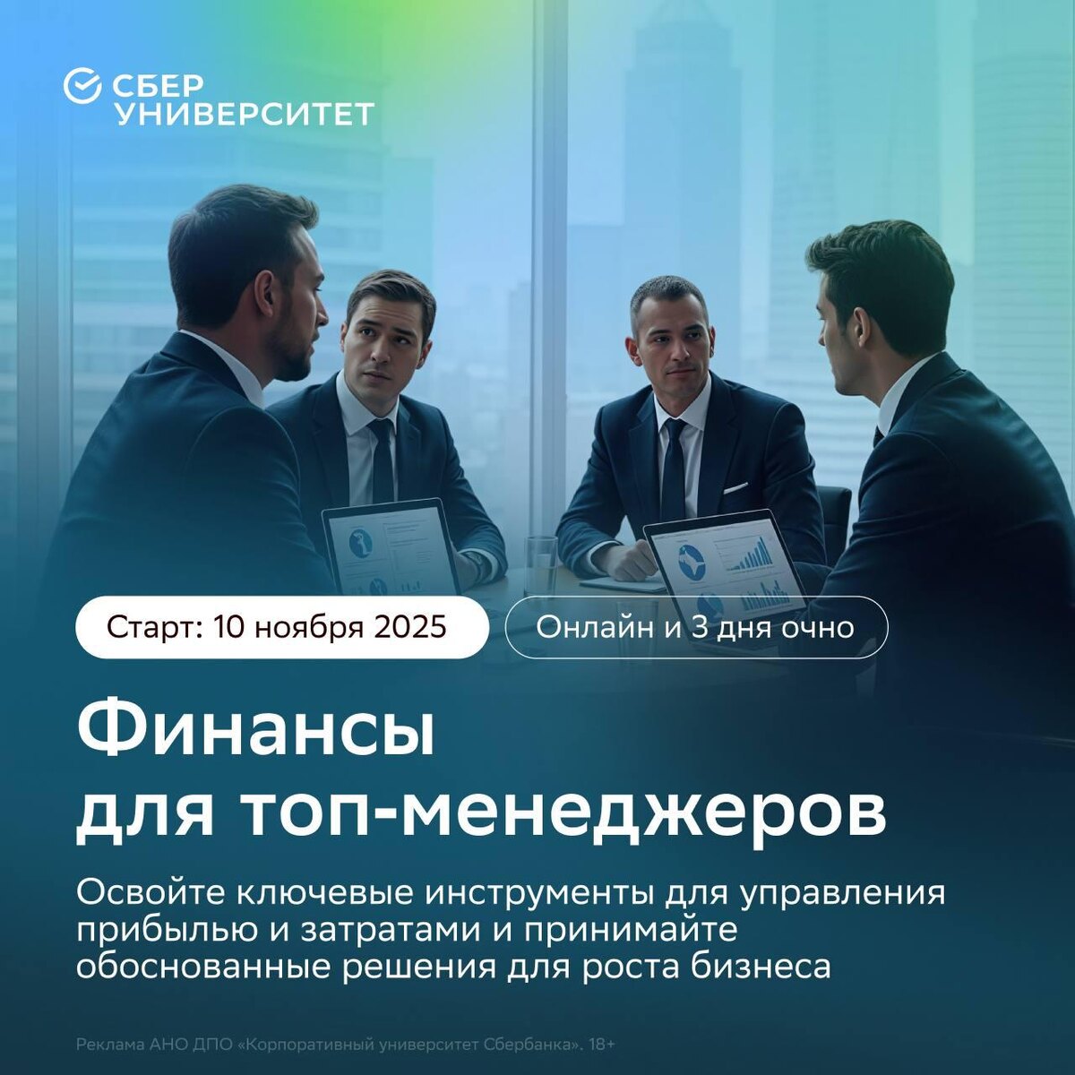 Заголовок: Финансовая грамотность для топ-менеджеров: новая программа от СберУниверситета СберУниверситет запускает программу «Финансы для топ-менеджеров», которая поможет управленцам анализировать показатели компании, выявлять точки роста и уязвимости у партнёров и конкурентов. Выпускники научатся правильно оценивать прибыльность продуктов, эффективность инвестиций и рыночную стоимость бизнеса для принятия обоснованных финансовых решений. Программа будет полезна для управленческих команд, которые смогут совместно работать с данными. Занятия начнутся 10 ноября и пройдут в гибридном формате: онлайн и с очными модулями в кампусе. ────────── ⚡️Важные новости – без лишнего шума!⚡️ Подпишись на канал и получай только суть: оперативно, чётко, по делу! 👉 ИнфоСплетник | @infospletnik