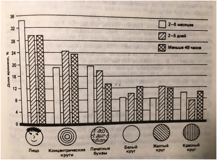В эксперименте измеряли время, в течение которого новорожденный смотрит на различные фигуры, цветные или черно-белые; оказалось, что он уже с первых часов жизни отдает предпочтение человеческому лицу.