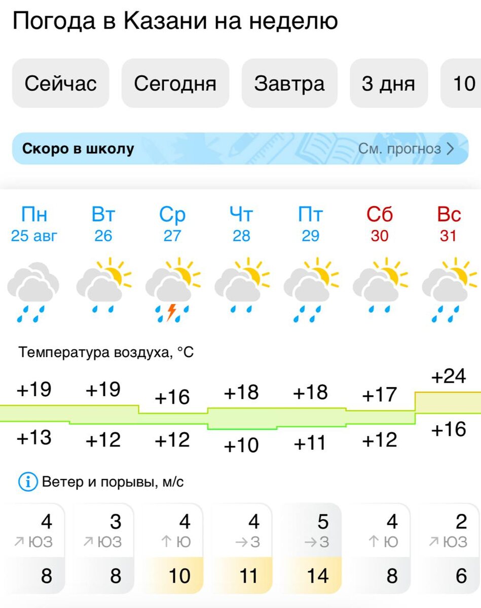 Лето в Казани подходит к финалу, и жара уже не вернётся. На этой неделе воздух в городе в среднем прогреется до +17…+19 градусов, а ближе к выходным температура может подняться до +24. Однако по-настоящему солнечных и тёплых дней ждать не стоит. Погода будет переменчивой: Ветер также усилится: ожидаются порывы до 5 м/с, из-за чего даже в относительно тёплые часы дня может казаться прохладнее. Таким образом, последняя неделя августа в Казани пройдёт под знаком перемен. Горожан ждут короткие солнечные паузы между дождями, свежий ветер и настоящее предосеннее настроение...