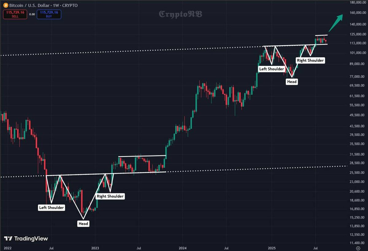 Фигура разворота или ускорение тренда? Смотрю на график биткоина и вижу любопытный паттерн: рынок словно зациклился на одном и том же приёме. Сначала — классический «перевёрнутый голова-плечи» внизу медвежки (левое плечо — зима 2022, голова — дно в 2023, правое плечо — весна 2023). Этот паттерн отработал почти по учебнику и запустил импульс вверх. Дальше — новый уровень. В 2024 рынок сформировал ещё один «голова-плечи», но уже не перевёрнутый, а прямой — только вот он сыграл не как разворот, а как ложный обманный манёвр. Обычно такую формацию трактуют как сигнал к падению. Но рынок взял и сделал обратное: пробил сопротивление и закрепился выше. Это и есть «психологическая мясорубка», когда толпа ждёт одного сценария, а маркетмейкер разворачивает его в противоположный. Сейчас картинка простая: биткоин стоит в боковике, аккурат под локальным сопротивлением в районе $125–126k. Если эта «полочка» наверху пробивается, то техническая цель по фигуре указывает в диапазон $150–160k. Что эт