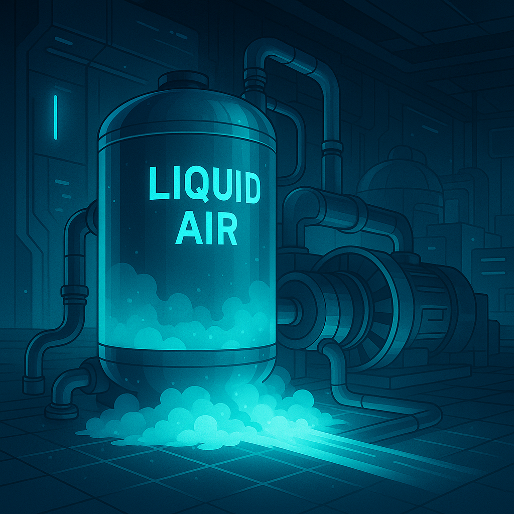 С переходом на возобновляемую энергетику перед обществом встаёт проблема хранения: солнце и ветер дают электричество нерегулярно, а нам нужен постоянный поток. Одно из решений — хранить энергию в жидком воздухе. Сжатый до сверхнизких температур, воздух превращается в голубоватую жидкость. Для этого воздух очищают от углекислого газа и влаги, затем охлаждают до ‑196 °C. В таком виде он занимает 1/700 своего объёма. Когда появляется потребность в энергии, жидкий воздух нагревают, и он расширяется, превращаясь в газ, который крутит турбину. В процессе можно использовать остаточное тепло от промышленности или солнечных коллекторов, что повышает эффективность. Система напоминает обратный холодильник: ночью, когда энергия дешёвая, вы «замораживаете» воздух, а днём получаете электричество. Это позволяет выравнивать нагрузку на сети и интегрировать больше возобновляемой генерации. Преимущества жидко‑воздушных аккумуляторов очевидны. Во‑первых, они не используют редкие материалы. Основной ресу