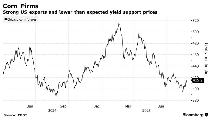 Это произошло благодаря высокому спросу и снижению производства Цены на кукурузу на Чикагской бирже достигли максимума за последний месяц благодаря высокому спросу и более низким, чем ожидалось, прогнозам по производству. Экспортные продажи кукурузы из США остаются на высоком уровне: Министерство сельского хозяйства зафиксировало дополнительные 2,8 млн тонн чистых продаж за неделю, завершившуюся 14 августа. По данным Pro Farmer, урожайность кукурузы в США по итогам ежегодного обзора составила 182,7 бушеля с акра, что является рекордом, но всё же значительно ниже предыдущих оценок Министерства сельского хозяйства США в 188,8 бушеля. Засуха и болезни сельскохозяйственных культур продолжают оказывать давление на цены, поддерживая их на высоком уровне. Цена на декабрьскую кукурузу увеличилась почти на 1%, достигнув 4,1525 доллара за бушель к 1:36 по сингапурскому времени. Пшеничные цены выросли на 0,5%, составив 5,30 доллара за бушель. Соевые бобы снизились на 0,2%, до 10,5675 доллара за б