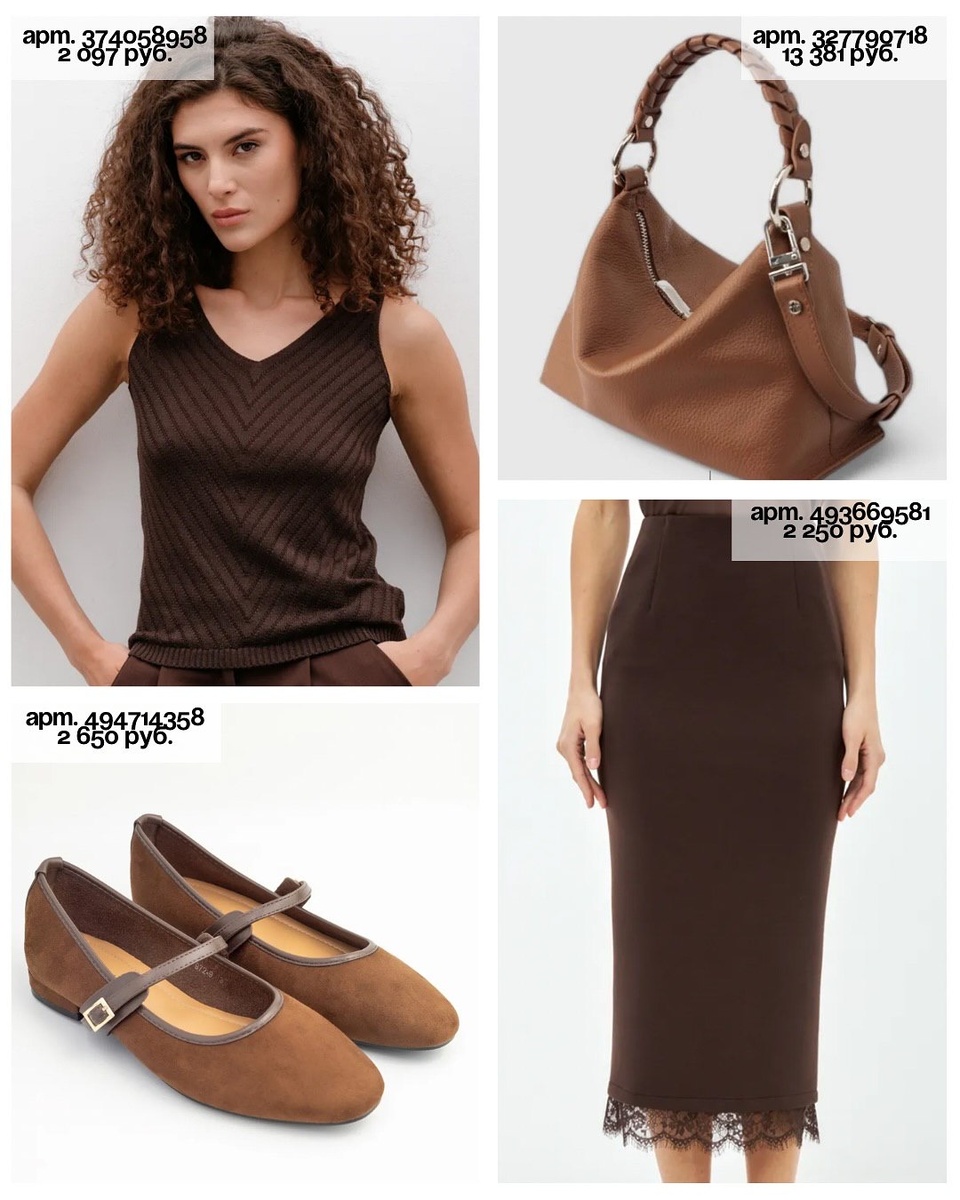 Совет стилиста: чтобы монохром заиграл «дорого», работайте перепадом полутонов: юбка — самый тёмный шоколад, жилет — на полтона светлее, сумка — ещё светлее, балетки — между ними.