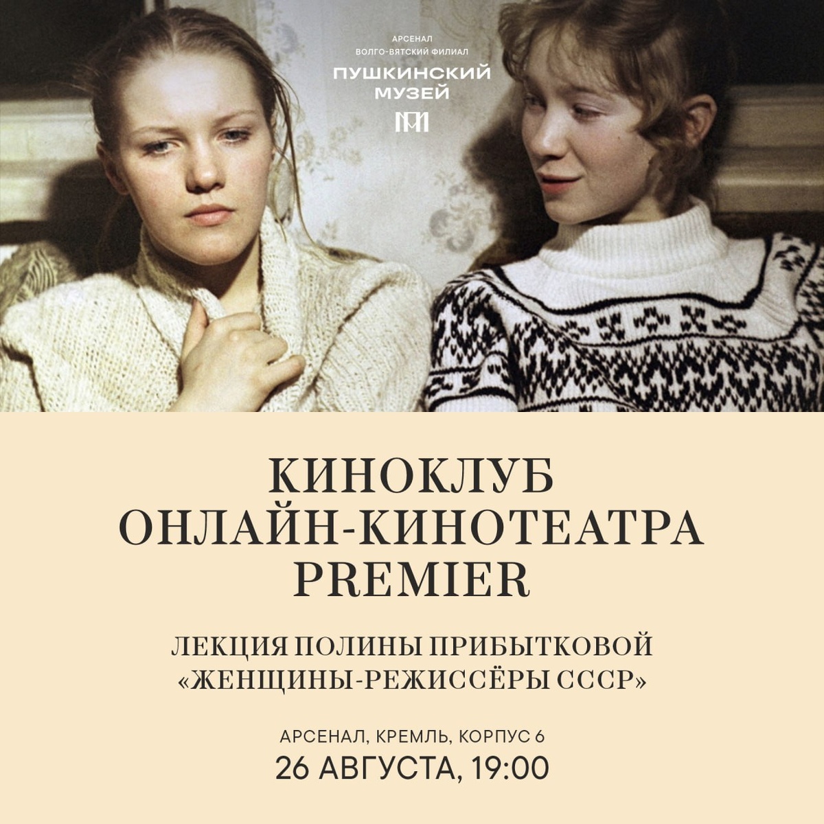 Киноклуб: лекция Полины Прибытковой «Женщины-режиссеры СССР» — 26 августа в 19:00 В Волго-Вятском филиале Пушкинского музея продолжается серия летних встреч Киноклуба PREMIER. Вторую лекцию, посвященную советским женщинам-режиссерам, проведет киновед и продюсер Полина Прибыткова. В прошлом Полина возглавляла отдел специальных проектов в Госфильмофонде России, руководила кинотеатром «Москино Юность», была программным директором кинотеатра «Иллюзион» и занималась спецпроектами в сети кинотеатров «Москино», а сейчас она отвечает за направление кино в Центре «Зотов». Полина расскажет о: ⚫️женщинах-режиссерах СССР, их подходах к работе и выборе тем, их профессиональном вкладе в мировой кинематограф; ⚫️стереотипах, связанных с понятием «женского кино»; ⚫️том, как сегодня работают с наследием советских кинематографисток. Событие пройдет в формате живого диалога со слушателями, без излишнего теоретизирования и употребления сложных терминов — в обсуждении можно и нужно участвовать! 26 авгу