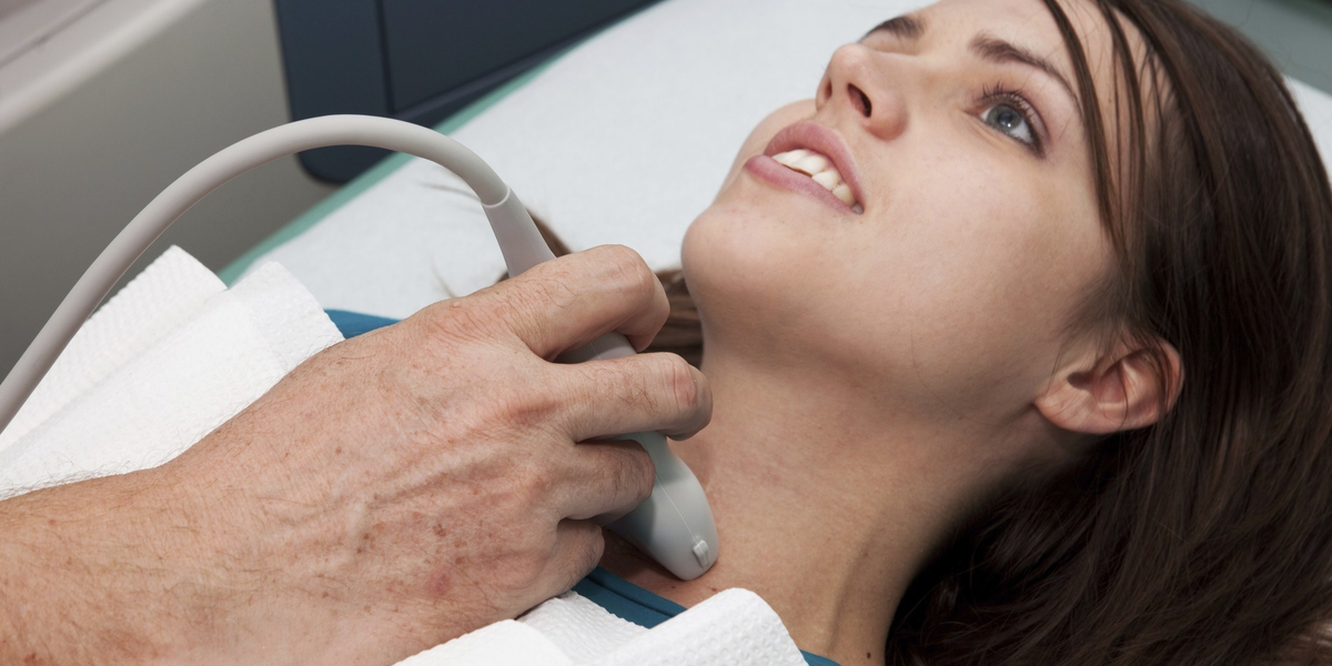 - Осмотр врача: пальпация щитовидной железы для обнаружения узлов или уплотнений.