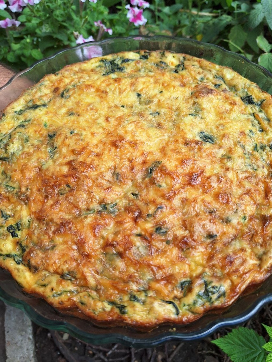 Вмешать обжаренный шпинат с луком. Вылить тесто в форму для запекания, форму предварительно смазать сл.масло и посыпать сухарями.