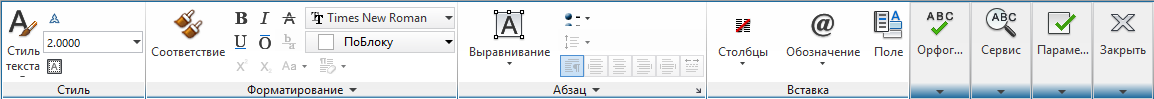 Вкладка ленты «Текстовый редактор» состоит из восьми панелей: Стиль, Форматирование, Абзац, Вставка, Орфография, Сервис, Параметры и Закрыть.