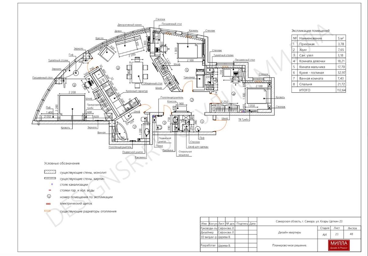 Представьте: вы просыпаетесь утром, открываете глаза — и первым делом видите величественную Волгу прямо за окнами. Свет льется в квартиру с самого рассвета, но вместе с этим возникает вызов: как обустроить дом, где нет ни одного прямого угла, а планировка напоминает полукруг? Такую задачу поставила передо мной мама с двумя детьми — мальчиком и девочкой. Нужно было создать пространство, которое будет и функциональным, и ярким по характеру, и в то же время элегантным. Решение нашлось в стиле современная классика. Вы любите, когда кухня становится центром жизни? Здесь собралась энергия всей квартиры. Это не просто кухня — это место, где звучат смех детей, где семья собирается вечером, а каждый ужин превращается в маленький праздник. - Для девочки — розовые оттенки, нежность и сказка. Комната получилась лёгкой и воздушной, но с деталями, которые будут «расти» вместе с хозяйкой. - Для мальчика - бело-голубая палитра, свежесть и простор. Пространство и для учебы, и для игр, и для мечтани