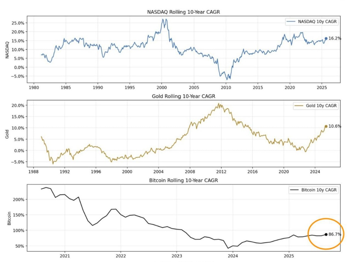 🚨 BREAKING: 🟠 Bitcoin's CAGR is still leaving gold and stocks in the dust