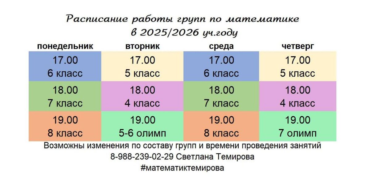Расписание на учебный год составлено. Если вам подходит время работы, напишите мне, пожалуйста @matematik_temirova, назначим предварительную диагностику. 4 класс вт + чт 18.00-18.50 (углубление программы, подготовка к поступлению в Физтех-лицей, ПФМЛ 239 и др.) 5 класс вт + чт 17.00-17.50 (углубленная математика, подготовка в профильные школы) 6 класс пн + ср 17.00-17.50 (углубленная математика, подготовка в профильные школы) 7 класс пн + ср 18.00-18.50 (углубленная математика, подготовка в профильные школы) 8 класс пн + ср 19.00-19.50 (углубленная математика, подготовка в профильные школы) *5-6 олимп вт 19.00-19.50 (олимпиадная математика для подготовки к поступлению в 6-7 классы, подготовка к участию в олимпиадах) *7-8 олимп чт 19.00-19.50 (олимпиадная математика для подготовки к поступлению в 8 классы, подготовка к участию в олимпиадах) Занятия в группах углубленной математики веду я совместно со вторым педагогом (одно занятие в неделю у меня, второе у другого педагога). Сто