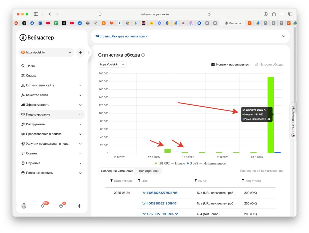 Я еще раз хотел обратить ваше внимание на то, что для больших проектов (сайтов) очень важно убирать технические ошибки, которые могут препятствовать индексации или обходу роботами. На картинке данные от Яндекса - если раньше он брал 50-100 страниц в сутки на обход, потом мы дошли до 6-8к в сутки, то вот на днях он взял 190к за раз. У google тоже рост ощутимый. Чем больше, тем лучше, но если у вас страницы качественные с его точки зрения. В общем - убирайте техничку, ускоряйте сайт, следите за ошибками в консоле мастеров и ... ждите :) Русский ИТ бизнес