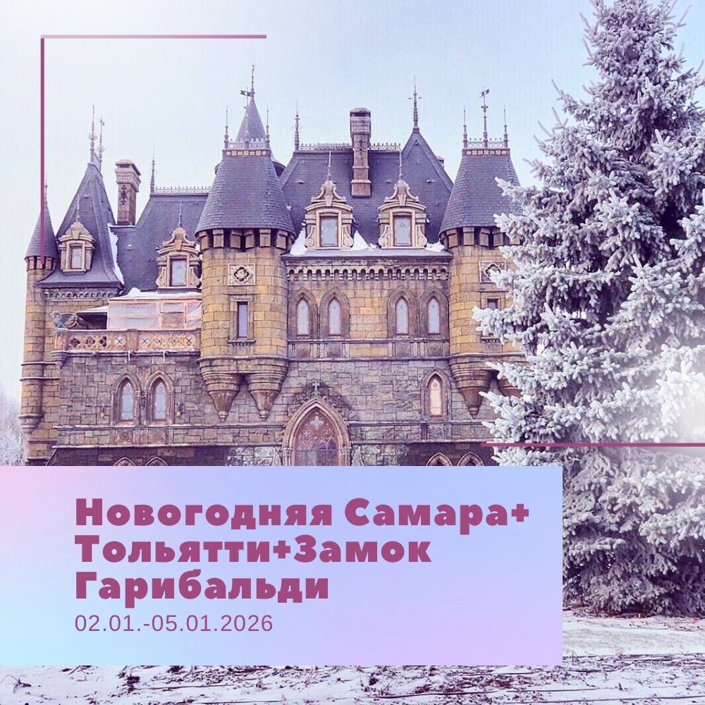 Новогодняя Самара + Тольятти + Замок Гарибальди❄ 🚌02.01- 05.01.2026 ✅1 день: Отправление 21:30 Н.Новгород, пл.Ленина. Возможные города посадки: Балахна, Заволжье, Арзамас, Павлово, Богородск, Ворсма, Дзержинск, Кстово. Ориентировочное время в пути 11 часов ✅2 день: Обзорная экскурсия по городу Самаре. Обед в кафе города. Экскурсия в музее «Бункер Сталина». Посещение Музей-усадьбы Алексея Толстого. Сбор группы. Отправление в гостиницу. Размещение в гостинице «Россия». Свободное время. Посещение комплекса "Самарские термы" (Московское шоссе, 18-й километр, 25А) за доп.плату (при бронировании тура - 3500 руб./чел.) - трансфер в одну сторону. ✅3 день: Завтрак в гостинице. Освобождение номеров. Сбор группы. Отправление в город Тольятти. Обзорная экскурсия по городу Тольятти. Обед в кафе города.Музей АО «АвтоВАЗ». Экскурсия по территории Туристического комплекса «Замка Гарибальди». Вауууу эффект Вам точно обеспечен!!! Без красивых фотографий Вы точно не останетесь!!! Сбор группы ориен