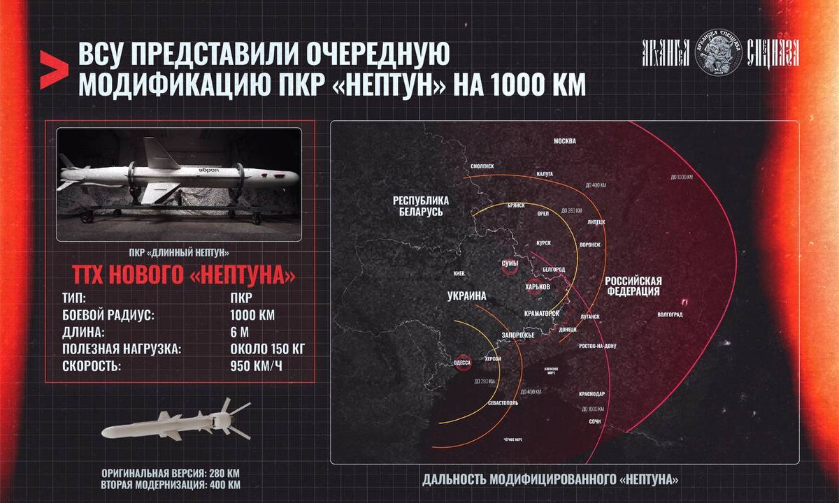 Изначально «Нептун» имел дальность 280 км и использовался для ударов в Черноморском регионе. Позднее его адаптировали для поражения наземных целей на дистанции до 400 км. Такие пуски отмечались в Запорожской области, на Курском направлении и в ДНР. Несмотря на заявления украинской стороны, количество запусков было ограниченным, а эффективность – умеренной.