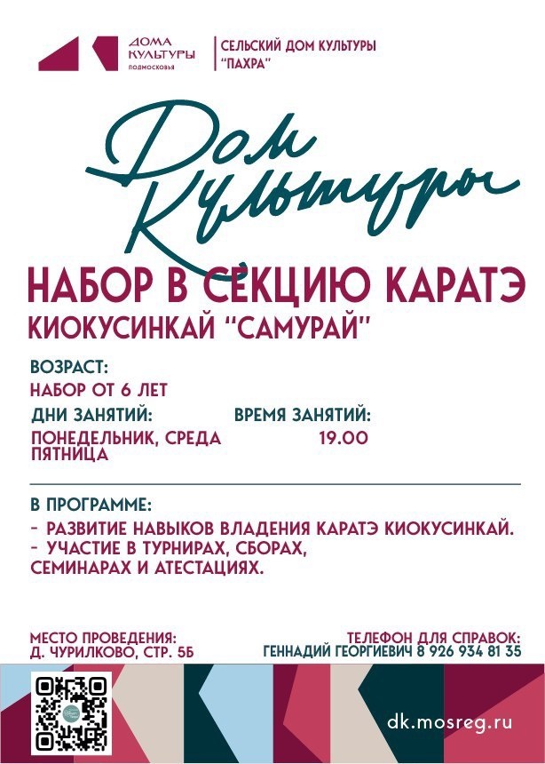 ✨ Друзья, у нас потрясающие новости 💣 Секция каратэ «Самурай» открывает набор 🗓️ Пн., Ср., Пт. ⏰ 19.00-20.30 3500 руб./мес. Занятия проводит опытный тренер - Макаров Геннадий Георгиевич, чьи ученики становились чемпионами России, Европы и Мира 🙌 Мы ждем вас 30 августа с 12.00 до 15.00 в СДК «Пахра». 🚫 Возраст: 6+ 🏢 Сельский дом культуры (СДК) «Пахра» 📍 г.о.Домодедово, дер.Чурилково, ул.Чурилково, д.5Б ✅ Мероприятия Домодедово https://dzen.ru/id/66f10385cc4c5a16f7b5fb02 http://vk.com/domodedovo_events http://dzen.ru/domodedovo_events