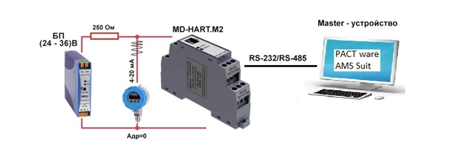 В данной схеме модем подключается параллельно HART-датчику (сохраняя его основной выход 4–20 мА на вход контроллера), и через интерфейс USB/RS-485 связывается с компьютером, на котором запущено программное обеспечение Pactware/AMS. MD-HART.M2 не опрашивает датчик автономно, а лишь транслирует протокол HART в цифровой вид для мастер-устройства. Этот подход удобен для параметрирования и диагностики отдельных устройств: инженер подключает ноутбук через модем к нужному датчику и получает полный доступ ко всем его внутренним переменным и настройкам, не нарушая работу основной аналоговой цепи.