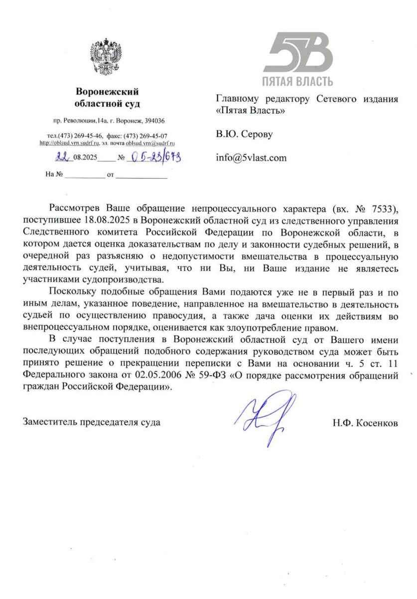 Областной суд решил: хватит писать! СМИ «Пятая власть» обвиняют в злоупотреблении правом переписки В Воронежской области назревает, пожалуй, уникальная история про свободу слова и судебную чувствительность. Областной суд, в лице Н.Ф. Косенкова, внезапно решил, что СМИ «Пятая власть», оказывается, злоупотребляют своим правом переписки. Представьте себе — направляем мы внепроцессуальные обращения, при чем с пометкой, что СМИ не в праве влиять на судебные решение, но с желанием обратить внимание на некоторые факты. Просим вышестоящие инстанции объективно и всесторонне разобраться, обратить внимание на несостыковки и принять справедливое решение. А суд вместо ответа по существу намекает: мол, перестаньте беспокоить, а то и во все перестанем отвечать. На наше обращение от 18.08 вместо ответа по существу мы получили целую лекцию о «недопустимости вмешательства». Суд пояснил: раз мы не являемся участниками процесса, то и оценивать доказательства, законность решений и вообще что-либо писать
