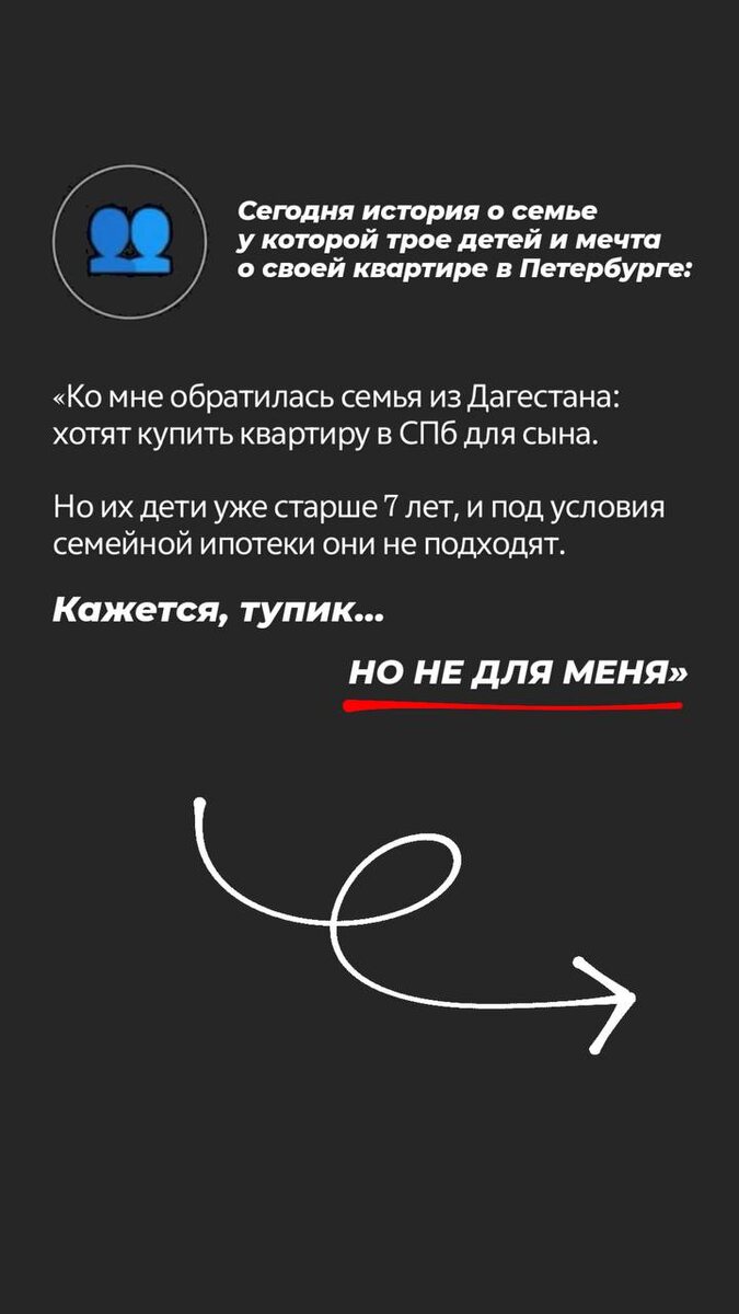 #Истории_реальных_сделок_RM ❗️КЛИЕНТ: семья из Дагестана, 3-е детей. Хотят купить квартиру в Санкт-Петербурге для старшего сына. ‼️ЗАПРОС: оформить семейную ипотеку. Но сразу столкнулись с нюансом: все трое детей старше 7 лет, а значит — под условия семейной ипотеки не подходят. ——— 📍РЕШЕНИЕ: я предложила рассмотреть вариант с «ДОНОРОМ » — это человек, у которого есть ребёнок до 7 лет и который готов стать созаёмщиком. Нашелся родственник, которому они доверяют т. к ему необходимо выделить долю в приобретаемом жилье , и мы включили его в сделку. Но сложности на этом не закончились. 📍НЮАНСЫ: — оба супруга пенсионеры, доходы — 13 000₽ и 15 000₽; — ипотеку им могли дать максимум на 12 лет; — первый взнос — всего 1,2 млн рублей. Конечно, были сомнения: примет ли банк такую заявку? Особенно учитывая, что сейчас требования к созаёмщикам ужесточились. ——— ❗️ПРОЦЕСС РАБОТЫ: ✅ мы собрали полный пакет документов, подали заявку в банк; ✅ получили одобрение на ипотеку; ✅ провели долгий