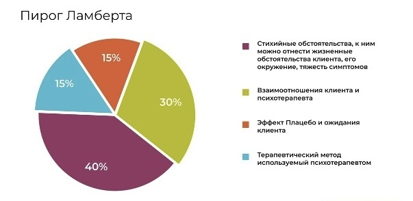 Пирог Ламберта — модель, созданная американским психологом Майклом Ламбертом. Он много лет изучал, что же на самом деле приводит к положительным изменениям в терапии. Концепция показывает, что единого критерия, который бы полностью описывал эффективность психотерапии, не существует. Результатом его работы стала эта наглядная круговая диаграмма (собственно, «пирог»), которая делит успех терапии на 4 неравные части-фактора. Это не абстрактная теория, а вывод, основанный на анализе сотен научных исследований. Понимание этой модели помогает более осознанно подходить к процессу терапии.