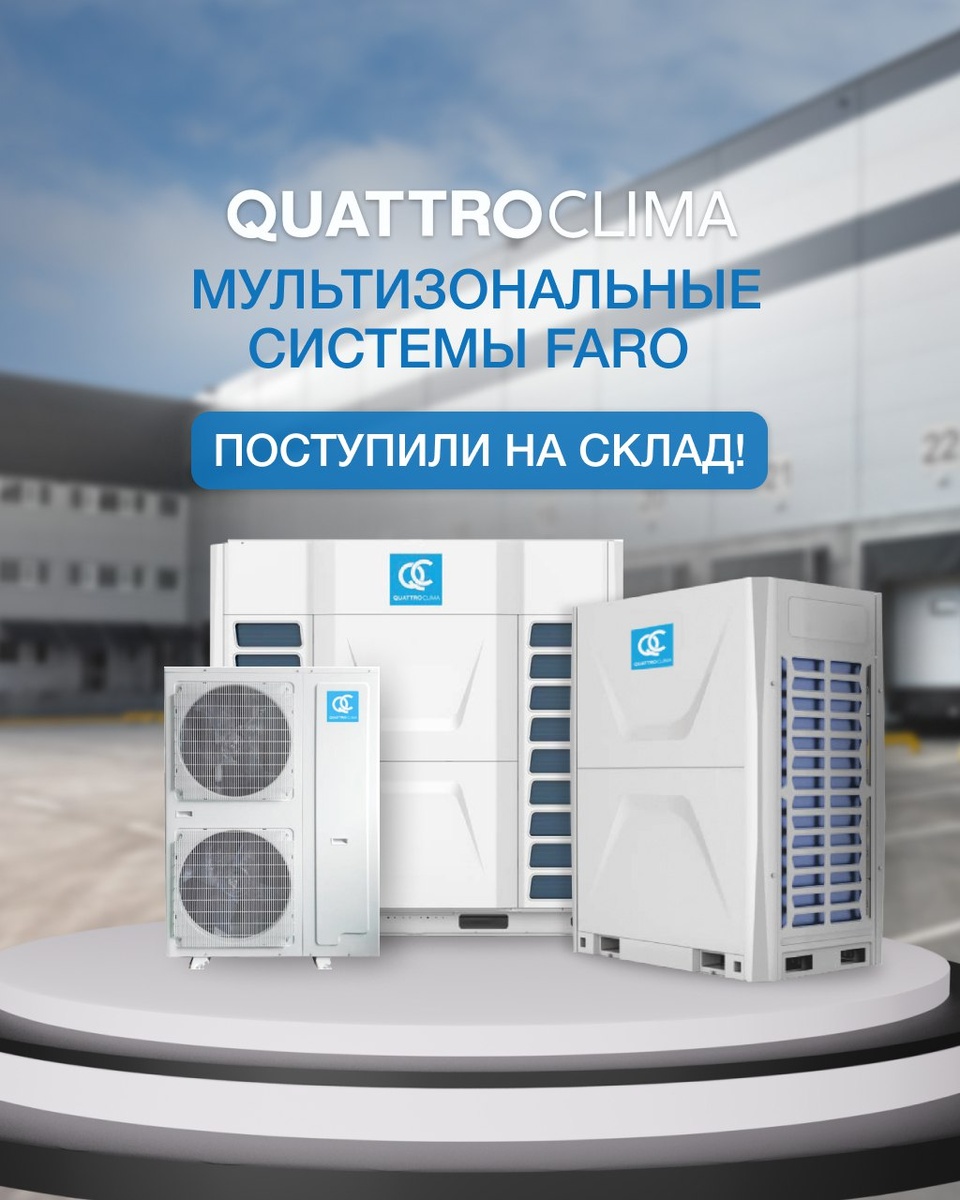 МУЛЬТИЗОНАЛЬНЫЕ СИСТЕМЫ QUATTROCLIMA FARO НА СКЛАДЕ! Напомним, что модельный ряд наружных блоков пополнился новой линейкой Modular +, которая тоже в наличии! Усовершенствованные системы защиты, большие длины трасс, богатый функционал и большой выбор внутренних блоков различного типа делают VRF-системы FARO оптимальным выбором для любых проектов. Интеграция QUATTROCLIMA FARO с BMS позволяет операторам зданий осуществлять централизованное управление системой кондиционирования, устанавливать графики работы в разных помещениях и своевременно реагировать на поступающие от системы сигналы. Преимущества: 🔹 К одному наружному блоку возможно подключить до 64 внутренних блоков различного типа и мощности. 🔹 Модельный ряд включает наружные блоки производительностью от 8 до 101 кВт. 🔹 Широкий выбор внутренних блоков: настенные, кассетные, канальные и напольно-потолочные. 🔹 Эффективное охлаждение при температуре наружного воздуха до +55 °C, обогрев — до –20 °C. Напомним, что стоимость обору