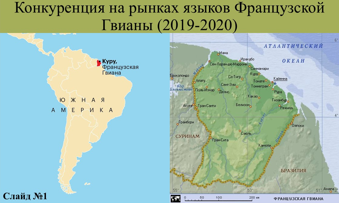 Помимо испано- и португалоязычного пространства в Южной Америке есть небольшой кусочек франкофонии. На континенте она представлена территорией, не обладающей суверенитетом, но являющейся заморским департаментом Французской Республики и называющейся Гайяной (Слайд №1). Чтобы не путать её с независимой Кооперативной Республикой Гайяной (бывш.колония Британии, а ныне член Содружества наций) и Суринамом (бывш.колония Нидерландов) будем называть данный заморский департамент Французской Гвианой.