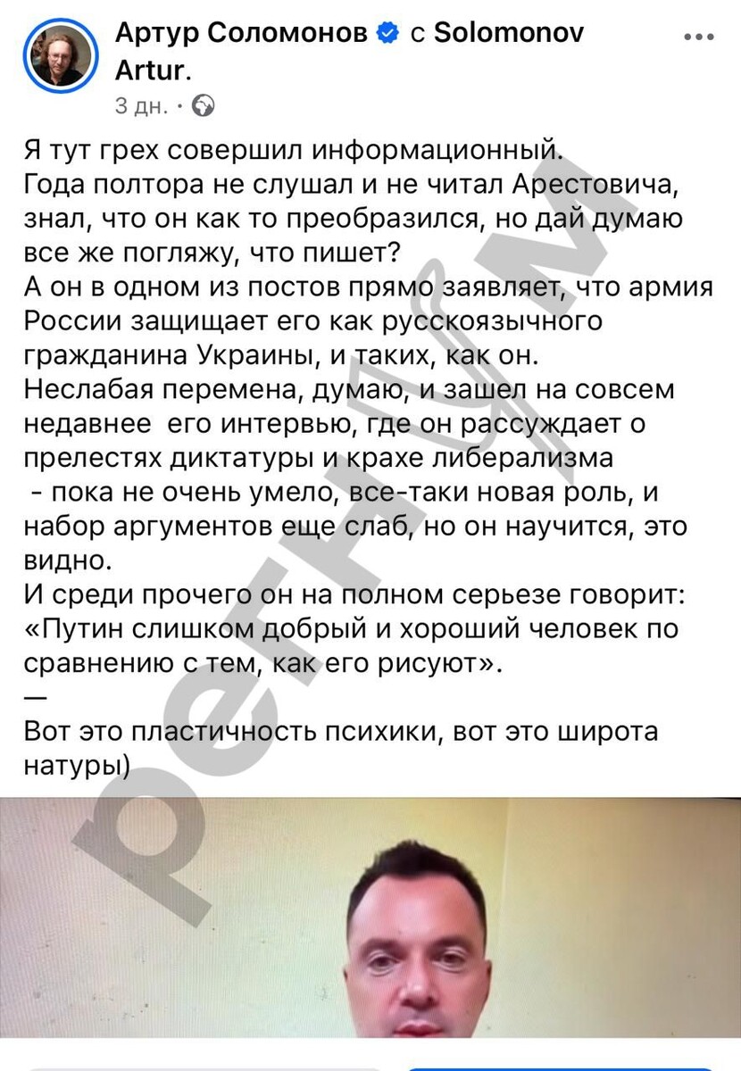 "Я тут грех совершил информационный. Года полтора не слушал и не читал Арестовича, знал, что он как то преобразился, но дай думаю все же погляжу, что пишет?" - опубликовал у себя в соцсетях Артур Соломонов - иноагент и создатель антироссийских пьес типа "Как мы хоронили Иосифа Виссарионовича" с помощью участия в которых антироссийские перебежчики, такие как иноагенты Анатолий Белый, Михаил Шац, Татьяна Лазарева, Александр Филиппенко, Чулпан Хаматова и пр. собирают деньги на помощь Незалежной. "А он в одном из постов прямо заявляет, что армия России защищает его как русскоязычного гражданина Украины, и таких, как он, - продолжил свое "расследование" иноагент Соломонов. - Неслабая перемена, думаю, и зашел на совсем недавнее его интервью, где он рассуждает о прелестях диктатуры и крахе либерализма- пока не очень умело, все-таки новая роль, и набор аргументов еще слаб, но он научится, это видно. И среди прочего он на полном серьезе говорит: «Путин слишком добрый и хороший человек по сравне