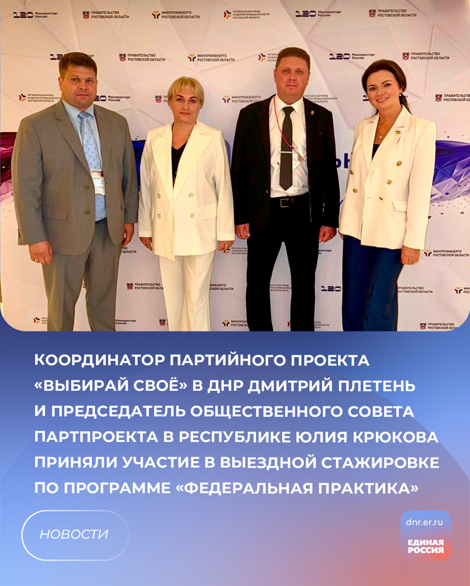 В Ростове-на-Дону прошла выездная стажировка по программе «Федеральная практика», организованная Минпромторгом России. От ДНР в ней поучаствовали наши партийцы: координатор партийного проекта «Выбирай своё» в ДНР Дмитрий Плетень и председатель общественного совета проекта в Республике Юлия Крюкова. Программа собрала участников из разных регионов, чтобы вместе обсудить, как поддерживать российскую продукцию и решать вопросы кадров в промышленности. В неформальной обстановке участники делились опытом, идеями и находили новые точки соприкосновения для будущего сотрудничества. «Одним из важных моментов стажировки стала встреча с Лидией Новосельцевой – заместителем председателя Законодательного собрания Ростовской области. Разговор получился содержательным и дал хороший импульс для развития диалога между бизнесом и властью. Такие встречи – не просто обмен мнениями, а реальный шаг к усилению связей между регионами и развитию отечественной промышленности», – отметил Дмитрий Плетень. #ЕРДНР #В