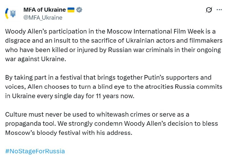 В ответ на пост Ukraine's new enemy – Woody Allen Country's MFA is angry at the filmmaker's 'insulting' participation in Moscow Film Week 'Culture must never be used to whitewash crimes or serve as a propaganda tool'