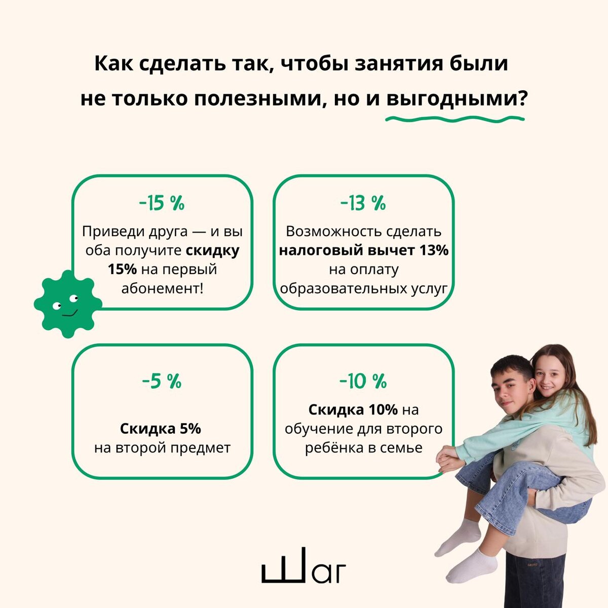 💡 В «ШАГе» мы верим, что качественное образование должно быть доступным каждому. Несмотря на рост и развитие нашего центра, мы сохраняем цены на обучение ниже рыночных. А ещё у нас есть гибкая система лояльности: семейные скидки, бонусы за рекомендации и специальные условия для постоянных учеников. Так мы можем помогать детям учиться с радостью, а родителям быть спокойными за их успех ✨ Посмотреть все наши направления и условия можно здесь