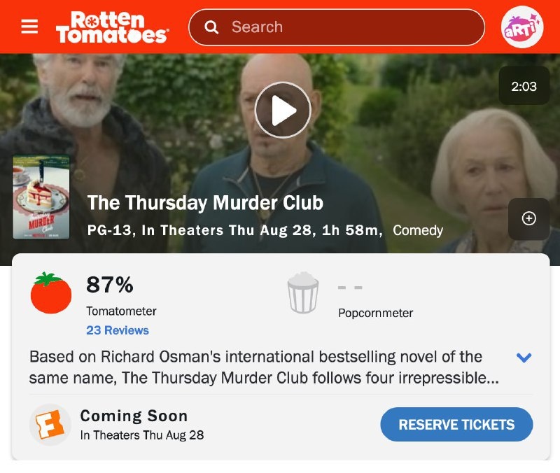 Детективный фильм «Клуб убийств по четвергам» собрал впечатляющие 87% на Rotten Tomatoes. Критики восхищаются актерской игрой и британской атмосферой. Сюжет рассказывает о пожилых людях, которые из-за скуки начинают расследовать нераскрытые убийства, прочитанные в газетах. Однако вскоре на их пороге происходит настоящая трагедия. Фильм выходит на Netflix 28 августа. Будем ждать его в бесплатных кинотеатрах. Наш уютный канальчик 🤖 Анимация | СhatGPT-4 | Помощь с резюме
