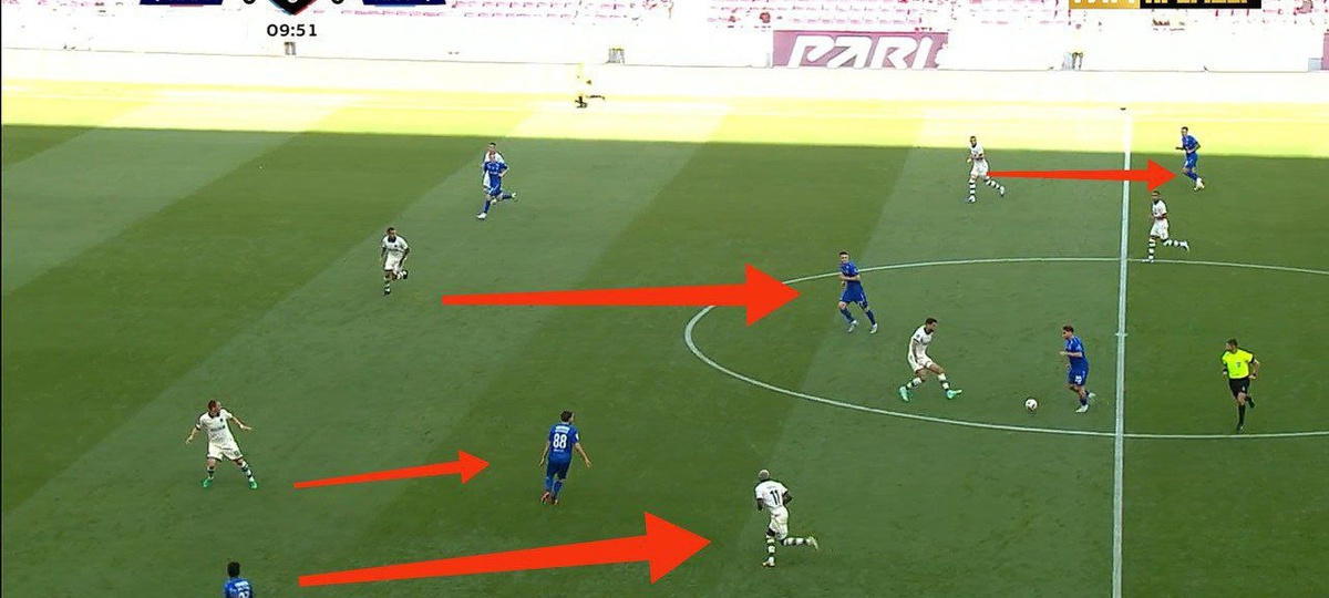 так как в этом варианте персоналки менее жесткие, Тормена не выдернулся за Ахметовым, но Перрен его проконтролировал. Билд-ап