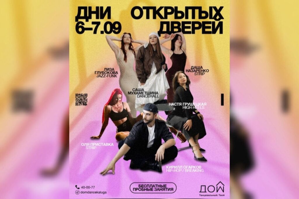 Калуга продолжает удивлять разнообразием культурных и творческих событий. Уже этой осенью у жителей города появится уникальная возможность бесплатно познакомиться с современными танцевальными направлениями, попробовать свои силы и почувствовать атмосферу творчества. 6 и 7 сентября в танцевальной студии «ДОМ» пройдут Дни открытых дверей. Мероприятие обещает стать настоящим праздником танца, где каждый сможет выбрать стиль по душе, познакомиться с профессиональными педагогами и приобщиться к яркой и дружной команде студии. Организаторы подготовили насыщенную программу, рассчитанную на два дня. Пробные занятия будут проходить по самым разным танцевальным направлениям, а вести их будут опытные педагоги, уже хорошо знакомые калужанам по своим выступлениям и мастер-классам. 6 сентября 7 сентября Такие мероприятия — отличная возможность не только попробовать разные стили, но и понять, какой танец ближе именно вам. Студия «ДОМ» традиционно открыта для людей разных возрастов и уровней подготовк