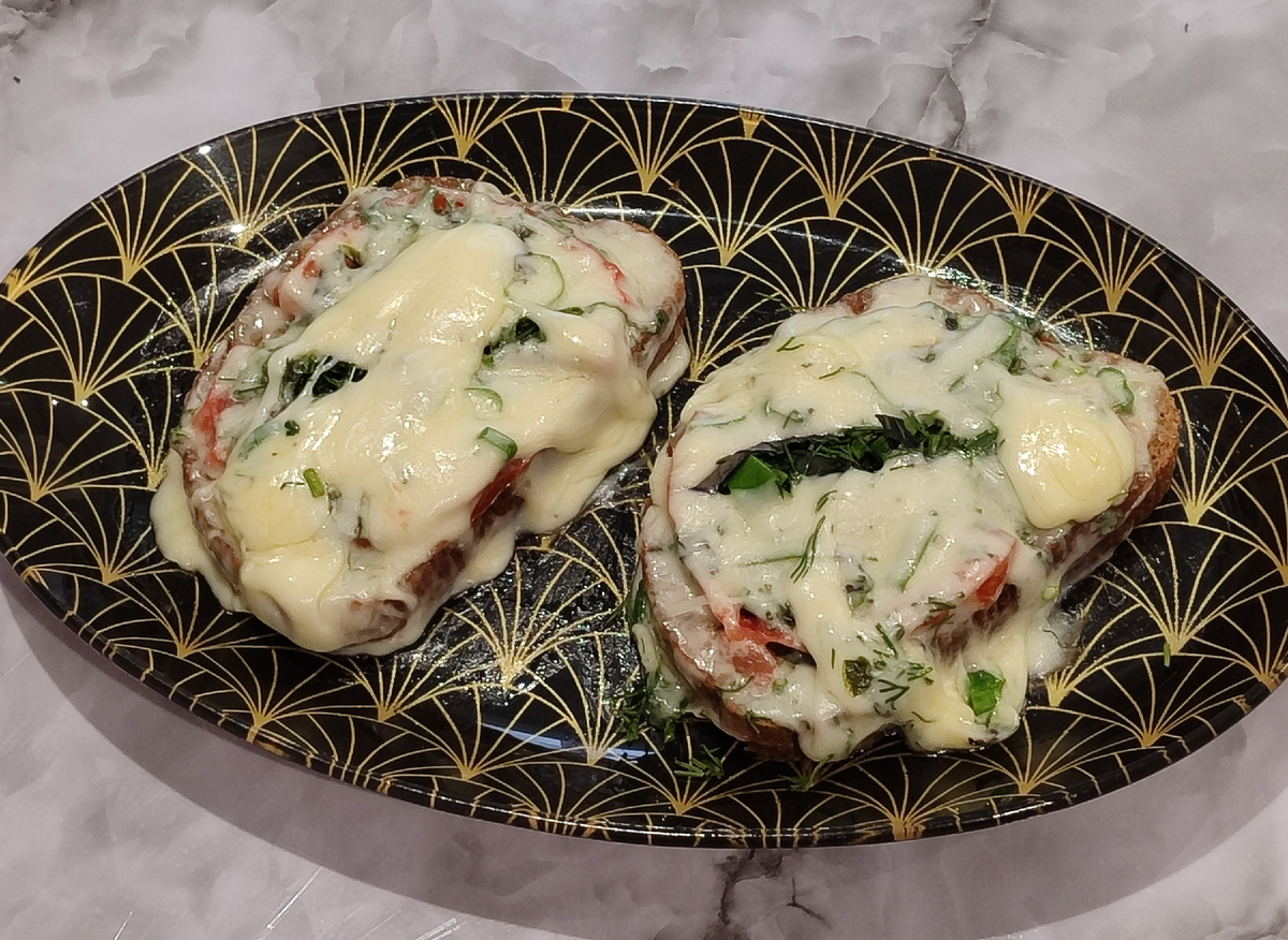 Сначала сделала в тостере тосты, потом натёрла их чесночком, сверху положила по дольке помидора, присыпала свежей зеленью и прикрыла двумя ломтиками сыра каждый бутерброд.