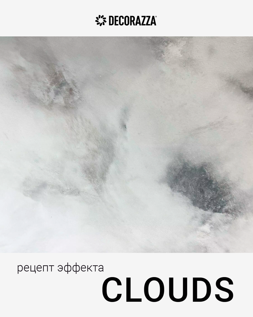 Эффект «Clouds» создает на стене мягкие, размытые переходы оттенков, которые напоминают легкие облака на небе. При разном освещении он меняется: на солнце выглядит воздушным и сияющим, а в мягком искусственном свете становится более глубоким и уютным. Такой финиш добавляет интерьеру динамику без агрессивных акцентов. 📌 Рецепт эффекта в традиционных карточках Decorazza. Главный материал: декоративная краска Decorazza Wall Arte Подходит к стилям: сканди, минимализм, неоклассика, прованс, романтика, ар-деко. Фишка: многослойная техника нанесения создает эффект объемных облаков с глубиной и мягким свечением.