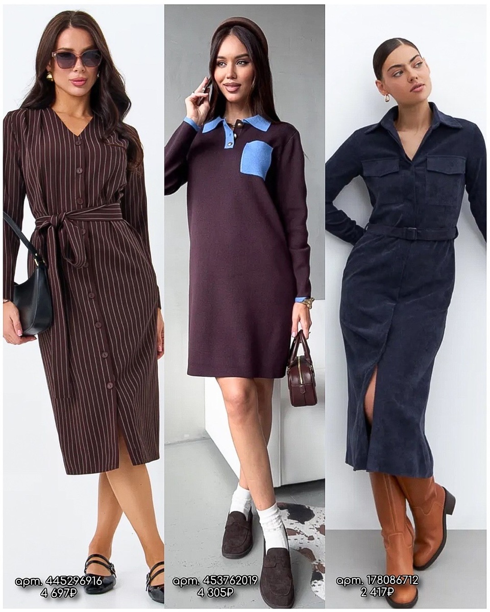 Осень — лучшее время для платьев. Утром добавили тренч, днём сняли и остались в комфортном образе, вечером сменили обувь — и уже «ужин». Я разобрала 15 моделей с WB (все на фото) и расписала каждую: что за фасон, как сидит, куда носить и микро-совет стилиста для «дорогого» итога. Артикул: 445296916, цена 4 697₽ Полуприлегающее миди, V-вырез, вертикальная полоска, пояс и ряд пуговиц. Идеально стройнит. Совет: замените пояс на кожаный ремень для дорогого эффекта. Артикул: 453762019, цена 4 305₽ Свободное миди, контрастные детали — освежают образ. Совет: лоферы + белые носки + тренч = трендовый лук. Артикул: 178086712, цена 2 417₽ Миди с поясом, накладные карманы, разрез. Практично и элегантно. Совет: с казаками будет дерзко, с сапогами-трубами — офисно. Артикул: 451802710, цена 3 713₽ Удобное миди с кулиской. Совет: затяните талию чуть выше линии — ноги длиннее. Артикул: 272909337, цена 1 265₽ Идеальное сочетание фактур. Совет: добавьте ремень-цепочку — разделит и соединит верх с низом