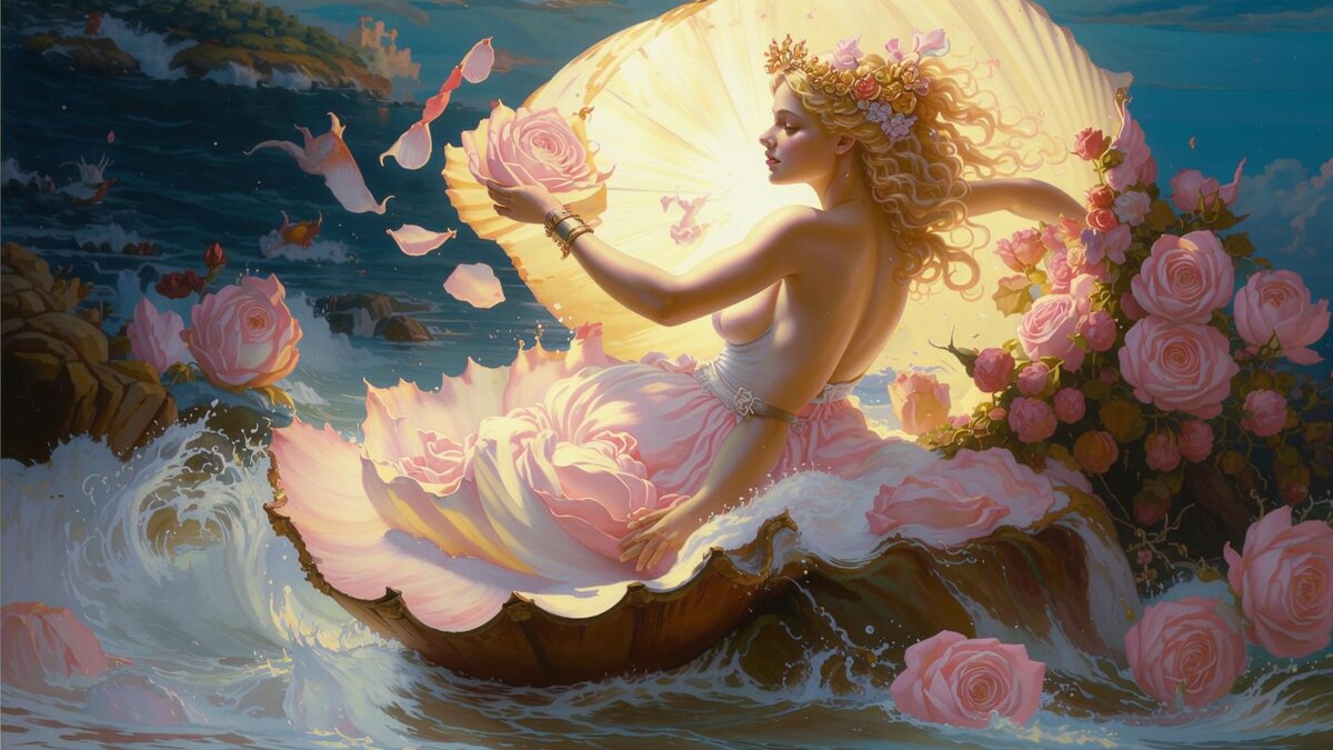 Первые шаги богини по берегу превратили песок в ковер из роз и фиалок. Морские раковины раскрывались, показывая жемчужины, а дельфины выпрыгивали из волн, чтобы взглянуть на чудо. Ветер Зефир подхватил новорожденную и понес на остров Кипр, где нимфы Времен Года одели ее в золотые ткани и научили ходить по земле.
