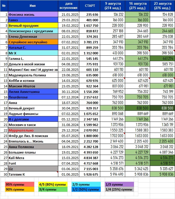 Здравствуйте, дорогие участники и наблюдающие! Вот и подошла к концу неделя, данные собраны, все кто хотел, отметились. В этот раз у нас многовато прогульщиков, есть и те, кто не явился уже второй раз подряд, а одну участницу мы похоже, и вовсе потеряли (Вечный декрет, №18). Есть ещё одна неделя чтобы отметиться в марафоне, и тогда все прогулы обнулятся, а если нет - то участница выбывает . Прогулы участников отмечаются в таблице зеленым цветом: сначала светлым, потом темнее, а последний - самым тёмным, и число подсвечивается белым для контраста, чтоб читалось. Если и после этого участник не явится, то я исключаю его из марафона и приглашаю нового. Не нужно пропускать марафон, даже если ваш результат не изменился, можно просто зайти, отметиться, поприветствовать всех. Мы же одна команда, хотя и каждый сам за себя. На этой неделе к нам присоединяется новая участница - Маркиз кис кис. Поприветствуем! И перейдём к итогам прошедшей недели. Как обычно, результаты у всех очень разные. Кто-т