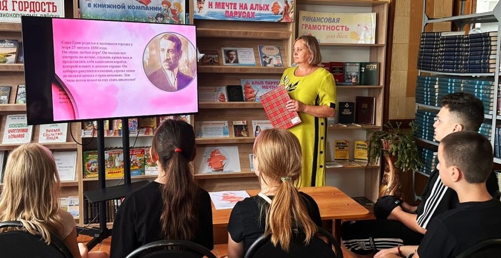 23 августа 2025 года исполнилось 145 лет со дня рождения Александра Степановича Грина, автора замечательных произведений, среди которых особенное место занимает повесть-феерия «Алые паруса». К этой дате в Развиленском отделе МБУК Песчанокопского отдела «МЦБ» прошло литературное путешествие «Алые паруса». С помощью презентации библиотекарь рассказала читателям о жизни и интересных фактах творческого пути А. Грина. Ребята познакомились с историей создания повести-феерии «Алые паруса», прочитали отрывки, определили главную тему и обсудили те проблемы, которые поднял автор: добро и зло, жестокость, жадность, месть, мнение окружающих и судьба человека. В завершение мероприятия сотрудники ДК продемонстрировали художественную постановку «Встреча Ассоль и старика Эгля». Атмосфера встречи получилась теплой и дружелюбной, читатели покинули библиотеку с новыми знаниями о творчестве Александра Грина и желанием углубить свое знакомство с его произведениями. К юбилею писателя в Краснополянском отдел