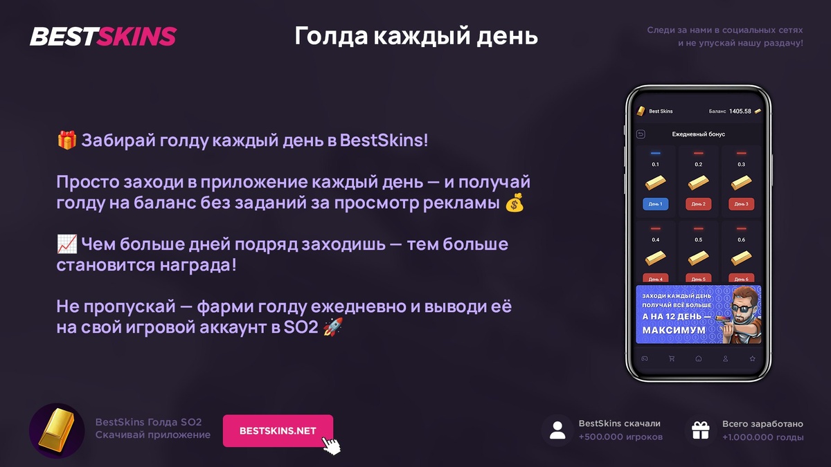 Голда каждый день в BestSkins SO2 Заходи каждый день и получай баланс! 📅 Чем дольше заходишь — тем больше награда 📈 Выводи голду прямо в SO2 без доната! 💰 📲 Скачать - https://bestskins.net