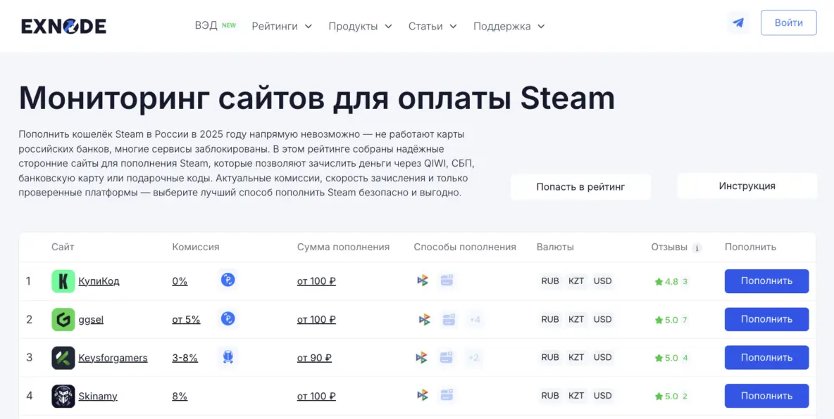 Не стоит искать случайные сайты через рекламу или сомнительные ссылки в соцсетях. В 2025 году единственным надёжным инструментом остаются официальные мониторинги вроде Exnode. Данный сервис регулярно проверяет актуальность сервисов и помогает геймерам безопасно пополнить Стим без комиссии в 2025 в России или в других странах, включая Казахстан и Беларусь.