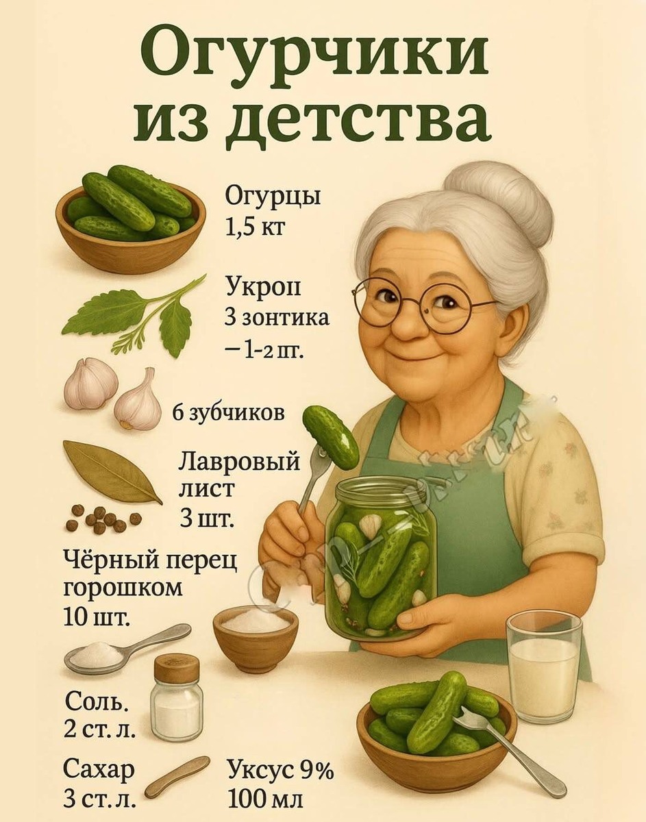 🥒 «Бабушкины хрустяшки» — огурцы с тем самым вкусом из детства | Хрустят, пахнут летом и свежестью, как будто только что из прохладного подвала. Никаких лишних ингредиентов — только то, что нужно. 🧾 Ингредиенты на 3 банки (по 1 л): Огурцы — 1,5 кг (мелкие, плотные) Укроп (зонтики) — 3 шт. Лист хрена — 1–2 шт. Чеснок — 6 зубчиков Лавровый лист — 3 шт. Чёрный перец горошком — 10 шт. Душистый перец — 6 шт. Маринад: Вода — 1,5 л Соль — 2 ст. л. с горкой Сахар — 3 ст. л. Уксус 9% — 100 мл 👩🍳 Как готовлю: Огурцы тщательно мою и замачиваю в холодной воде на 4–5 часов. В стерильные банки кладу укроп, хрен, чеснок и специи. Огурцы укладываю плотно, вертикально. Заливаю кипятком, даю постоять 10 минут, воду сливаю. Готовлю маринад: кипячу воду, добавляю соль, сахар, в конце — уксус. Заливаю кипящим маринадом, сразу закатываю и укутываю до полного остывания. 💚 Через несколько недель — идеально хрустящие, ароматные, как у бабушки. | Сохрани рецепт, если скучаешь по тем самым огурцам из