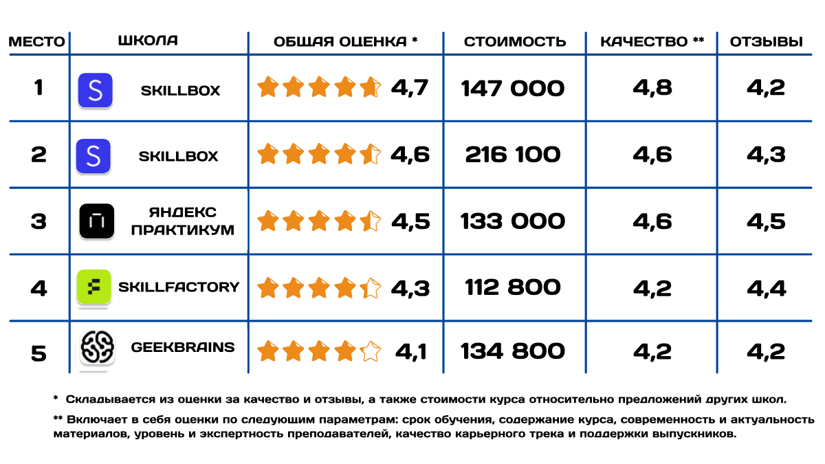 Рейтинг школы 4 из 5. Выпускники отмечают глубокое погружение в профессиональную тематику, большое количество практических заданий и актуальность изучаемых инструментов и технологий.