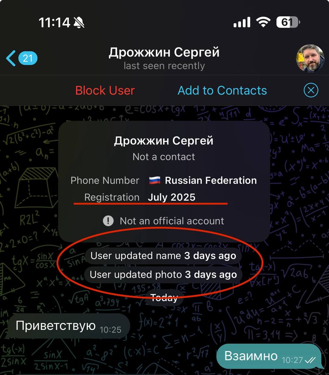 Все мы умные и внимательные. И, конечно, никогда не попадёмся на развод. (Нет, это не так). Даже у самых осторожных из нас есть друзья, знакомые, родственники, которых может коснуться беспардонная рука злодея. Поэтому расскажу об одном виде мошенничества, набирающего популярность в Telegram, всего за год я сталкиваюсь с ней уже третий раз. В первый — я совсем не сразу понял, что меня пытаются развести. Схемы отрабатывают так, чтобы вызывать минимум подозрений. Как работает схема Тебе пишет «бывший руководитель» или коллега. Фото знакомое, имя правильное. Начинается всё дружелюбно: пара фраз про «как дела», пара бытовых деталей из прошлого. Затем с места в карьер — у нас идёт проверка ФСБ. В компании утечка персданных или разборка в отношении текущего сотрудника по подозрению в экстремизме. В первый раз мне даже прислали скан приказа ФСБ. Следующий шаг — подготовка к разговору с «сотрудником ФСБ».