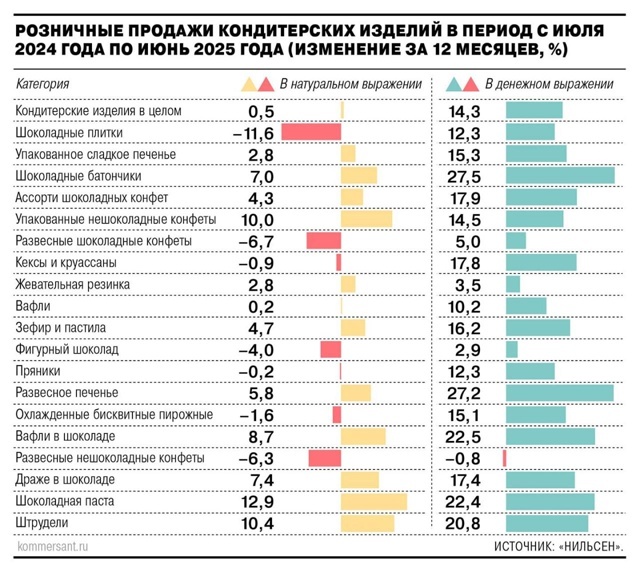 С сентября крупные бренды снова поднимут стоимость: 7Days, Alpen Gold, Milka и Oreo подорожают на 2-14%, а Orion, Choco Pie и Choco Boy — на 5-7%. В рознице цены могут вырасти ещё на 10%. Неурожай какао-бобов в Западной Африке и новые пошлины на какао-продукты, которые вступят в силу с мая 2025 года (3-5%). Это влияет на производителей, заставляя их повышать цены. Спрос на шоколад уже снизился на 11% из-за экономии покупателей. Эксперты прогнозируют, что в 2025 году продажи продолжат падать, особенно на горький шоколад, в котором больше всего какао.
