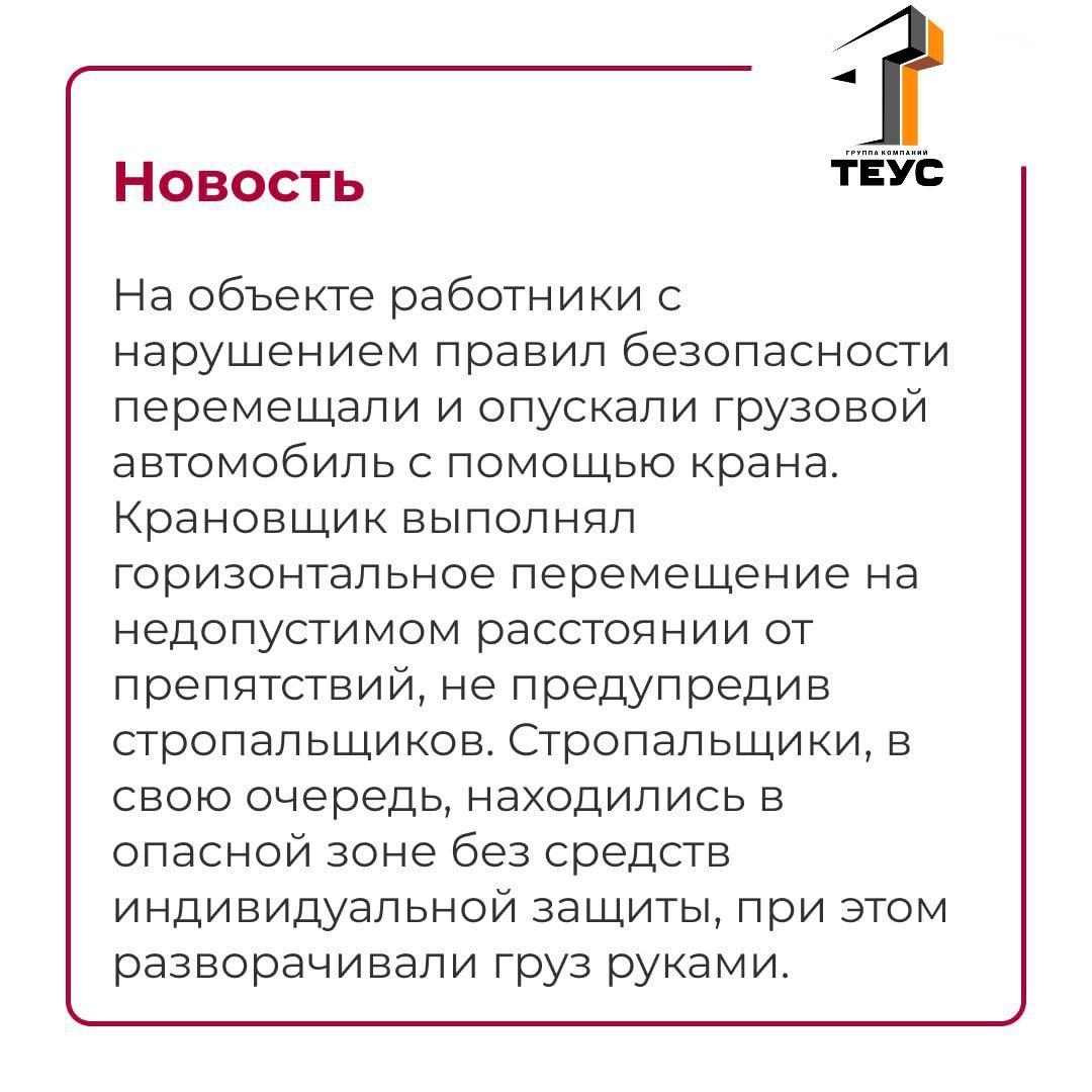 Трагедия на объекте: рабочий погиб под КАМАЗом 🚨 КАМАЗ перемещали краном без четкого плана, связи и защиты. Люди находились прямо под грузом. Стропы не выдержали, и многотонный автомобиль упал — один из работников оказался под ним. Пострадал человек. Слишком высокая цена за отсутствие порядка: — никто не следил за зоной перемещения, — не было команд и связи между крановщиком и стропальщиками. Когда нарушаются все правила, трагедия становится почти неизбежной. В таких ситуациях ни опыт, ни скорость реакции не спасают. Спасти могут: четкие правила, обучение, контроль и строгий запрет на самодеятельность. Будьте внимательны и соблюдайте безопасность на рабочем месте! 🛠⚠️ А поможет в этом наша услуга обучение по охране труда в выездом на ВАШЕ предприятие teus-company.com/obuchenie-c-viezdom В этом посте есть большое видео, которое не загрузилось в Дзен. Откройте оригинал поста в телеграме, чтобы его посмотреть