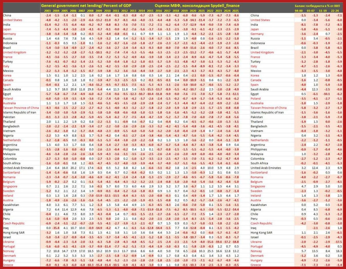 Анализ государственных бюджетов по странам мира даёт удивительный результат Оказывается, самая напряженная ситуация с бюджетом не у США (оценочный дефицит консолидированного бюджета около 6.5% от ВВП в 2025 году), а у … Китая – 8.6%, Индии – 6.9%, Бразилии – 8.5% и Египта – 12.1% по оценкам МВФ на 2025 год. Расширение дефицита бюджета в Китае идет с видимой эскалацией – 7.1% от ВВП в 2022-2024 (за три года) vs 2.4% в 2011-2019, в Индии дефицит бюджета устойчиво высокий – 8.1% vs 7.2%, а в Бразилии – 6.1% vs 5.8% соответственно. В 2024 году лишь 8 крупных стран имели профицит консолидированного бюджета: Аргентина – 0.9% после погромов от Хавбера Милея, ОАЭ – 4.8%, Швейцария – 0.6%, Сингапур – 4.4%, Ирландия – 4.4%, Португалия – 0.7%, Норвегия – 12.8% и Дания – 4.5%. Семченко 👉Подписаться