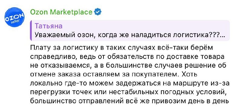 Ozon и логика обязательств по доставке Официальный аккаунт Ozon в тг написал интересное: да, доставка может задерживаться из-за перегрузки маршрутов или других факторов, но ведь товар всё-таки привозят — значит обязательства выполнены. Поэтому возвраты по таким заказам компенсировать не будут. На мой взгляд — это прям классика двойных стандартов. 📌 Для FBS всё работает иначе: если продавец передал заказ позже — он платит повышенную комиссию маркетплейсу. Но по логике самого Ozon обязательство ведь тоже выполнено — заказ передан, пусть и позже. То есть когда маркетплейс задерживает — «мы всё равно доставили, значит всё нормально». А когда селлер задержал — «штраф и повышенная комиссия». Видите разницу? 😉 Marketplace_biz - отдай свой буст каналу