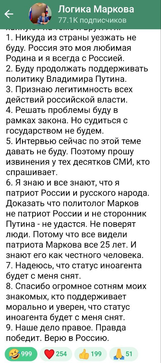 На тг-канал иноагента Маркова я подписался исключительно ради угарных комментарий, там люди от души сострадали в его горе. Но сегодня Сергей Марков комментарии к своим постам отключил, видимо устал от искренних слов поддержки😁
